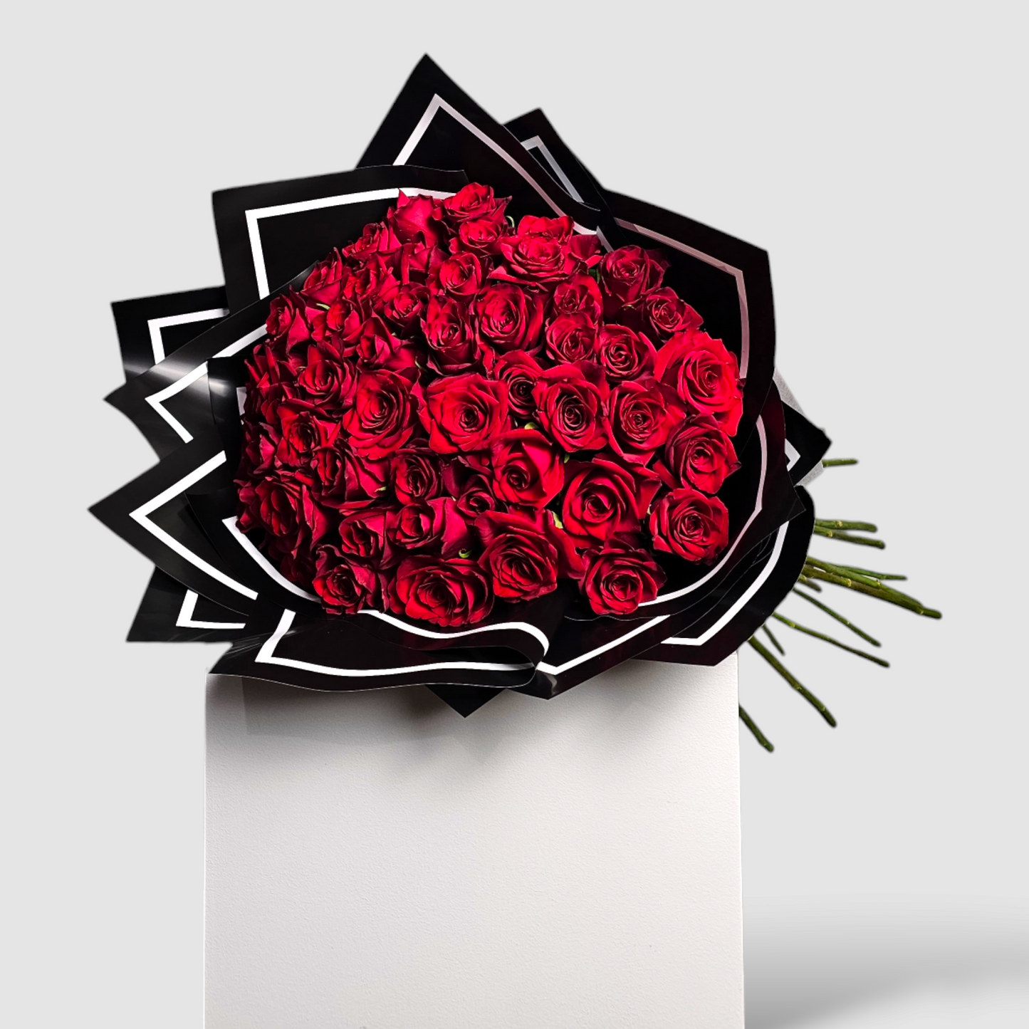 Add a romantic touch to any occasion with our 50 Red Roses Bouquet! The stunning flowers are elegantly arranged and come in a sleek black wrap. Whether it's for Valentine's Day or just to show your love, this bouquet is the perfect choice. Order now and spread the love!