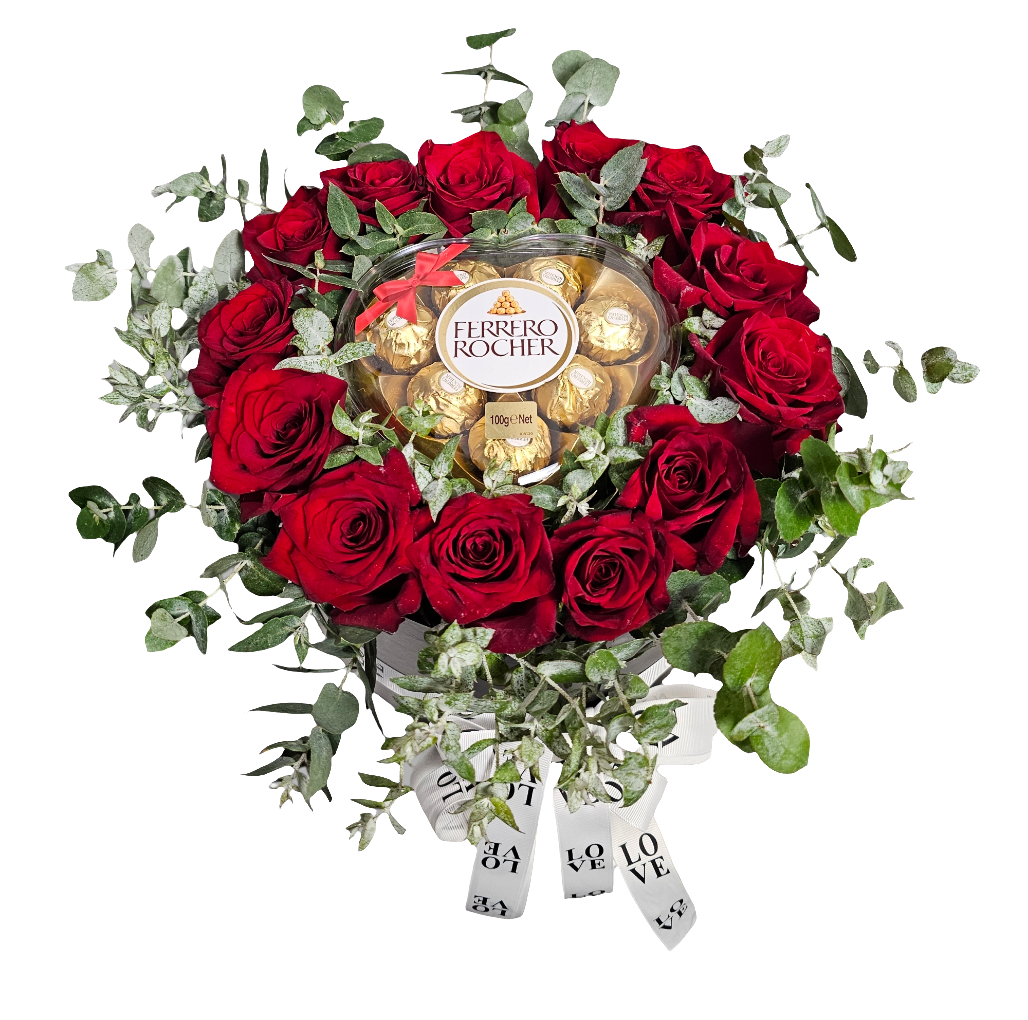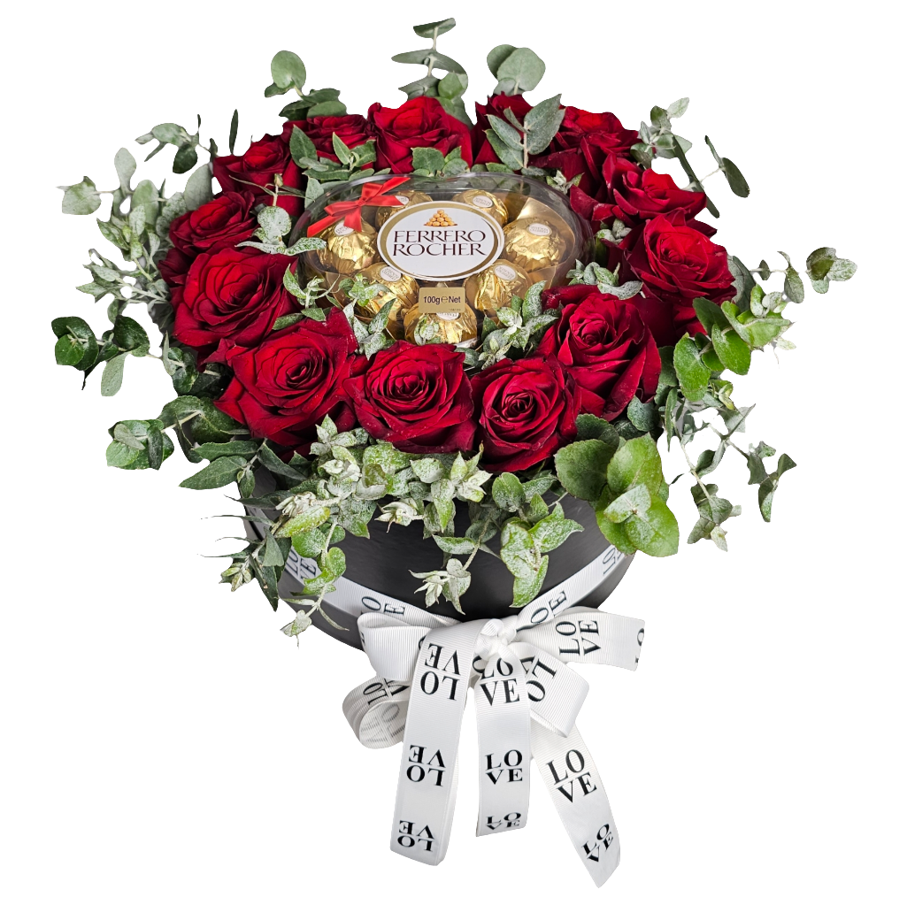 Indulge in love and luxury with our Luxe Love Red Roses Hatbox! This stunning arrangement features red roses and Ferrero Rochers, perfectly arranged in a heart shape. Perfect for Valentine's Day or any special occasion, this hatbox will make your loved one feel truly appreciated and adored. Treat them to a truly unforgettable gift with our Luxe Love Red Roses Hatbox.