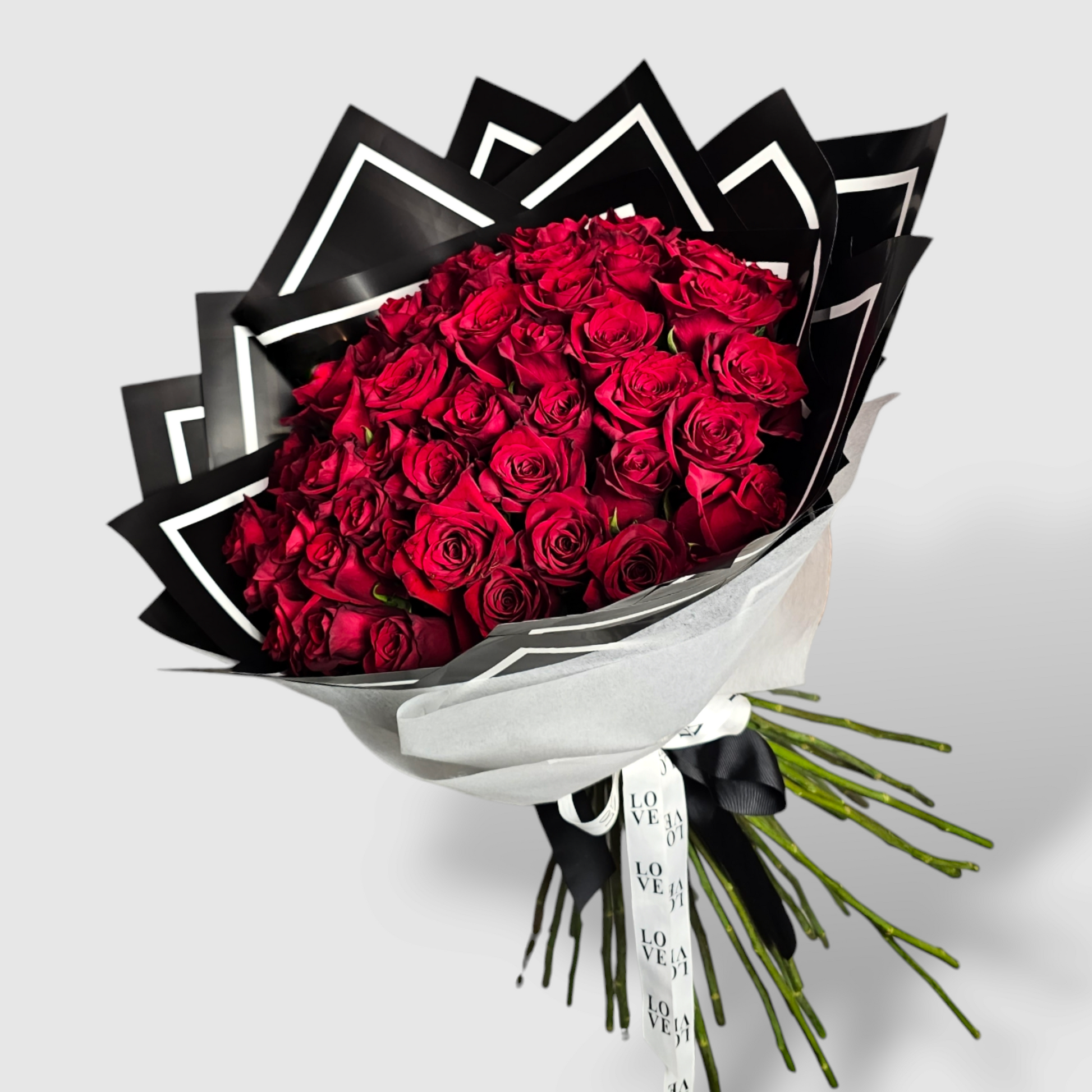 Add a romantic touch to any occasion with our 50 Red Roses Bouquet! The stunning flowers are elegantly arranged and come in a sleek black wrap. Whether it's for Valentine's Day or just to show your love, this bouquet is the perfect choice. Order now and spread the love!